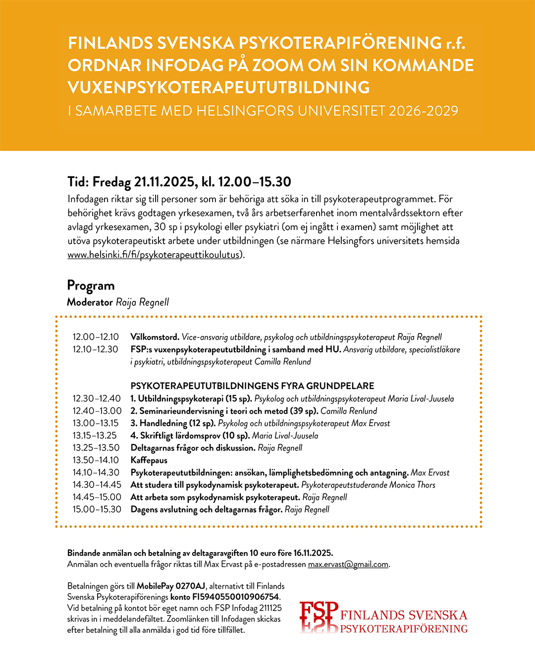 Finlands Svenska Psykoterapiförening ordnar 2022-2026 en psykoterapeututbildning med psykodynamisk inriktning. Utbildningen ger behörighet att erbjuda intensiv individuell psykoterapi till vuxna.